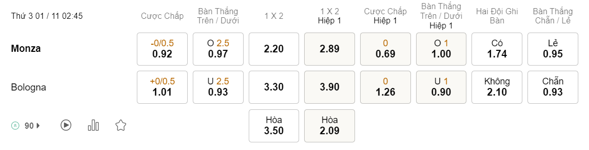 Tỉ lệ kèo Monza vs Bologna