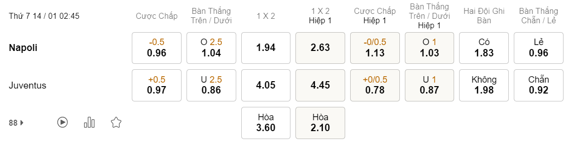 Soi kèo hiệp 1 Napoli vs Juventus: 1.13*0/0.5*0.78