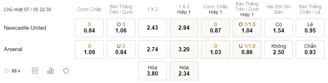 Soi kèo châu Á Newcastle vs Arsenal: 0.84*0*1.09