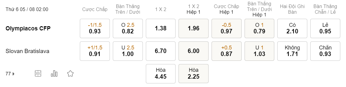 Tỉ lệ kèo Olympiakos vs Bratislava