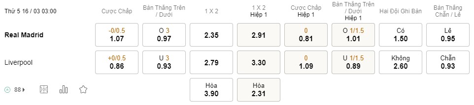 Tỉ lệ kèo Real Madrid vs Liverpool