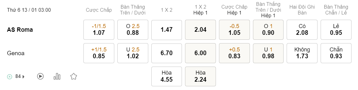 Tỉ lệ kèo Roma vs Genoa