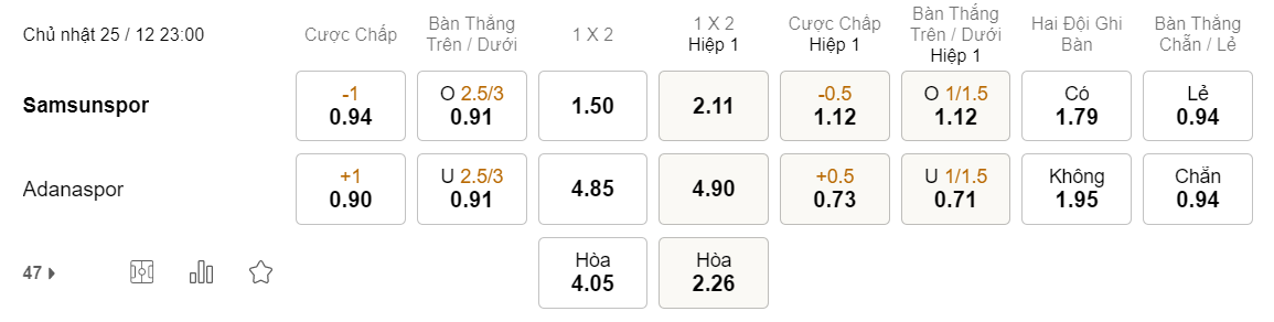 Như đã phân tích, dù đang có phong độ tốt nhưng hàng công Samsunspor vẫn cần thêm thời gian để tạo ra đột biến. Lịch sử chỉ ra, có tới 2/3 lần gần nhất Samsunspor đối đầu Adanaspor, bàn thắng chỉ xuất hiện ở hiệp thi đấu thứ 2. Vì vậy khả năng cao hiệp 1 sẽ khép lại mà không có bàn thắng nào được ghi.