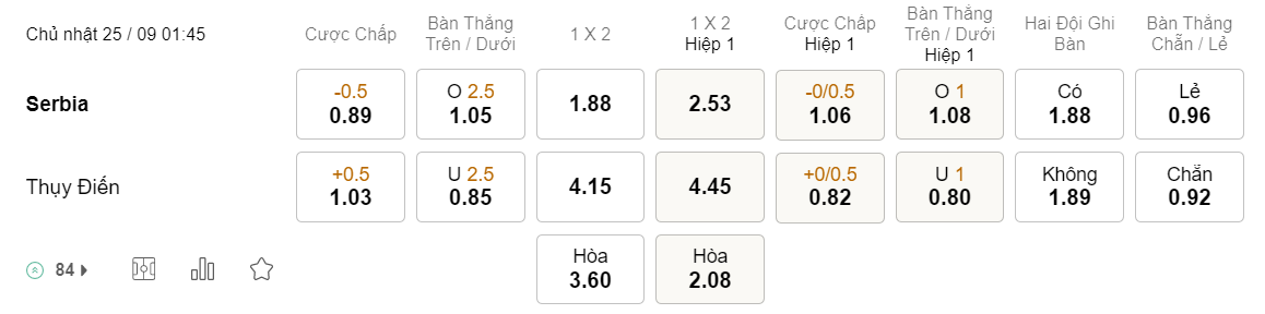 Tỉ lệ kèo Serbia vs Thụy Điển