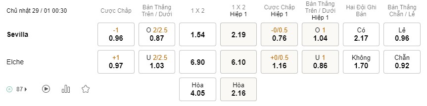 Soi kèo tài xỉu Sevilla vs Elche: 0.87*2/2.5*1.03