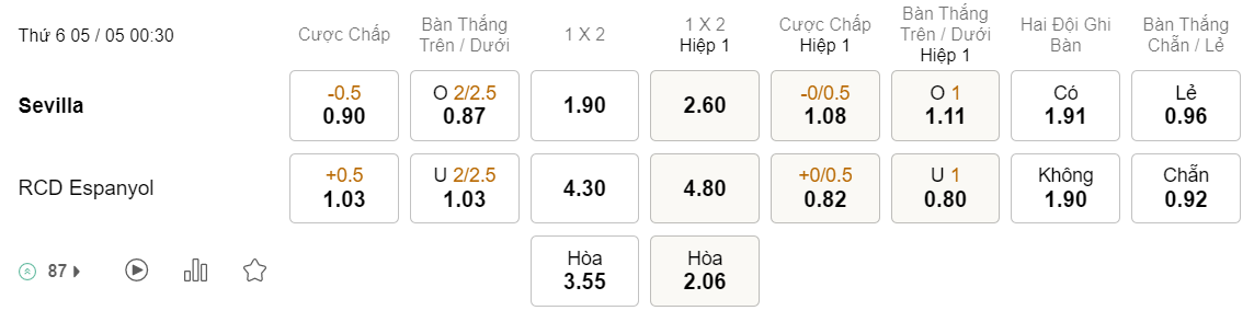 Soi kèo tài xỉu Sevilla vs Espanyol: 0.87*2/2.5*1.03
