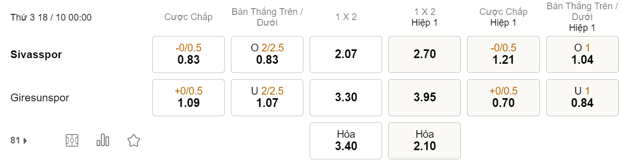 Phong độ tuy có chênh lệch nhưng thực lực 2 đội thì lại khá tương đồng vì vậy các trận đấu giữa Sivasspor và Giresunspor thường khép lại với không nhiều bàn thắng được ghi. Cụ thể, ¾ lần gần nhất cặp đấu này diễn ra, NHM chỉ chứng kiến nhiều nhất 2 bàn thắng được ghi mỗi 90 phút. Vì vậy, các chuyên gia của Vebo TV nhận định tỉ lệ nổ Xỉu ở trận đấu này sẽ là khá cao.