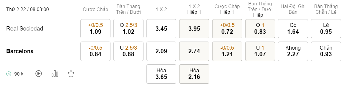 Soi kèo châu Á Sociedad vs Barcelona: 1.09*0/0.5*0.84
