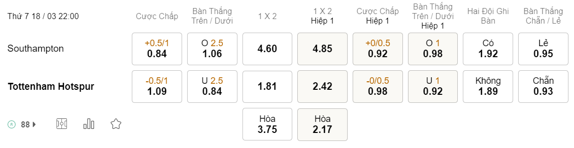 Tỉ lệ kèo Southampton vs Tottenham