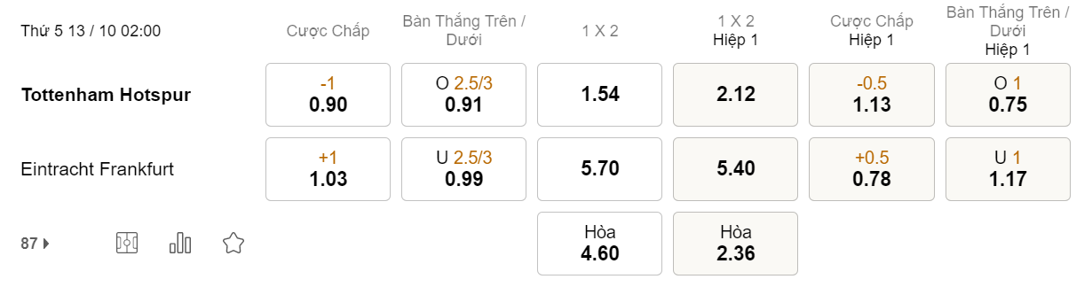 Tỉ lệ kèo Tottenham vs Frankfurt