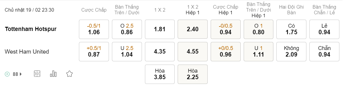 Soi kèo hiệp 1 Tottenham vs West Ham: 0.94*0/0.5*0.96