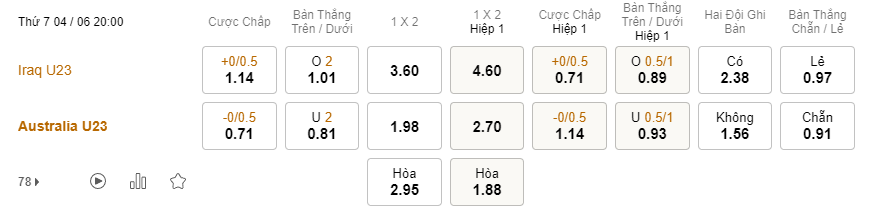 Soi kèo hiệp 1 U23 Iraq vs U23 Australia: 0.71*0/0.5*1.14