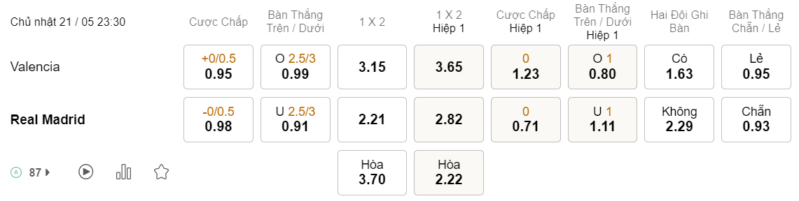 Tỉ lệ kèo Valencia vs Real Madrid