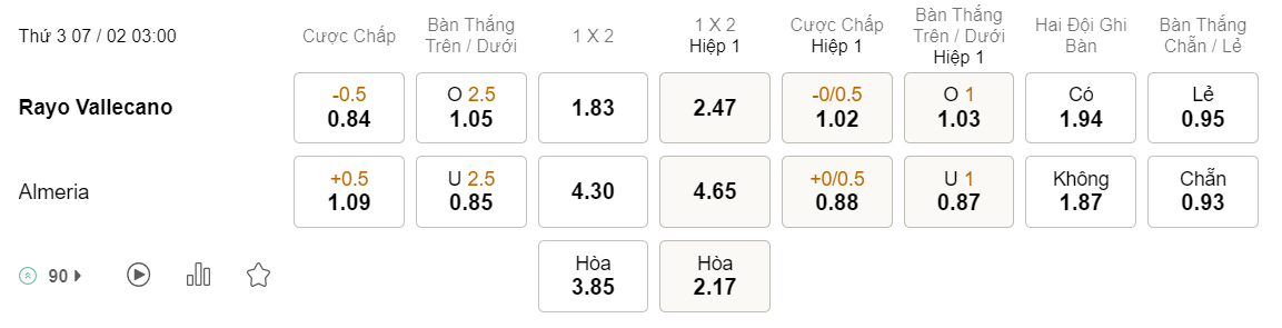 Soi kèo hiệp 1 Vallecano vs Almeria: 1.02*0/0.5*0.88