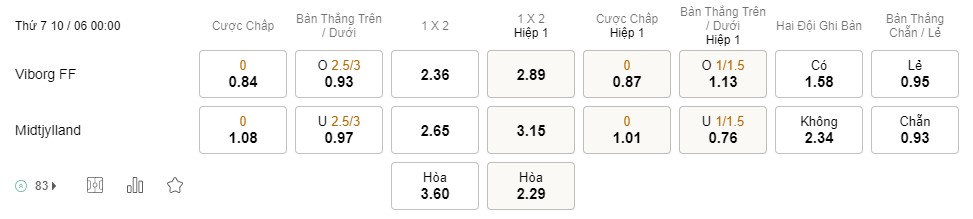Soi kèo châu Á Viborg vs Midtjylland: 0.84*0*1.08