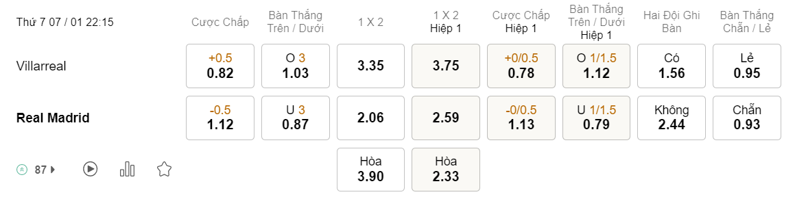 Tỉ lệ kèo Villarreal vs Real Madrid
