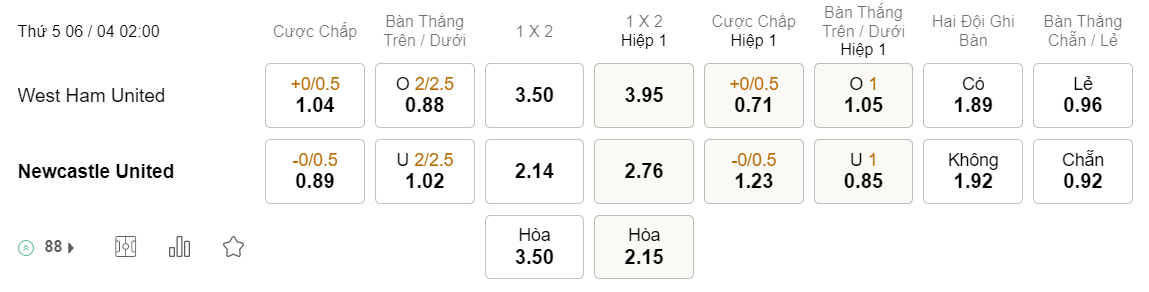 Soi kèo tài xỉu West Ham vs Newcastle: 0.88*2/2.5*1.02