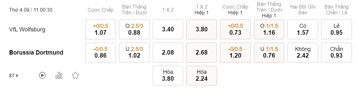 Tỉ lệ kèo Wolfsburg vs Dortmund